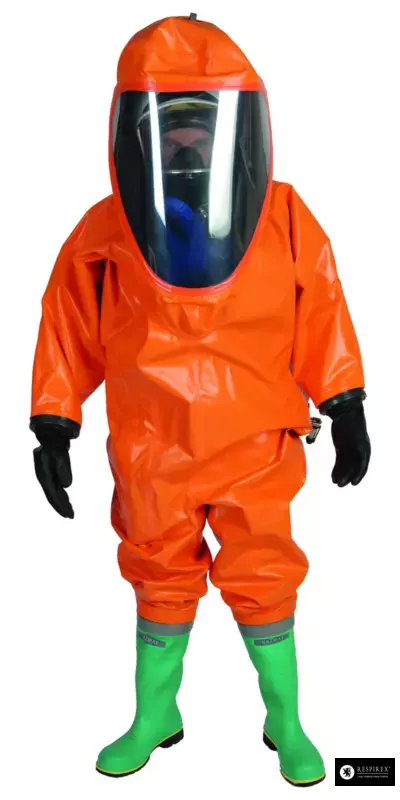 Gaspak in gelamnieerd viton, de meest resistente grondstof voorherbruikbare pakken. Pak met vervangbare laarzen. Het persluchtapparaatwordt binnen het pakgedragen. Voorzien van een aansluiting voor een meerurenventiel. Met vervangbare handschoenen. Het gaspak wordt geleverd in een koffer. Beschikbaar in: rood. Maten: te specifiëren.