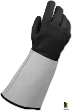 Deze handschoen is speciaal ontwikkeld ter bescherming tegen vloeibare gassen onder zeer lage temperaturen. Het Gore-Tex membraan verzekert de waterdichtheid. Amerikaanse montage. Het rundsnerfleder is olie- en waterafstotend én hittebestendig behandeld. De handschoen heeft een kapmanchet van 20 cm lang en is gevoerd in wol.