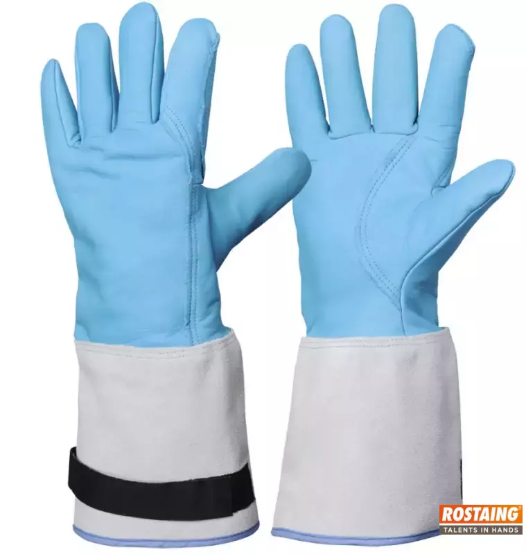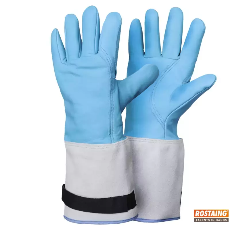 Blauwe microporeuze cryogene handschoen in SAFEGRIP gevoerd met molleton wol. Beschermkap van 15cm in rundsleder. Voorzien van sluiting met klittenband op manchette. Dikte: 1mm. Lengte: 40cm.
