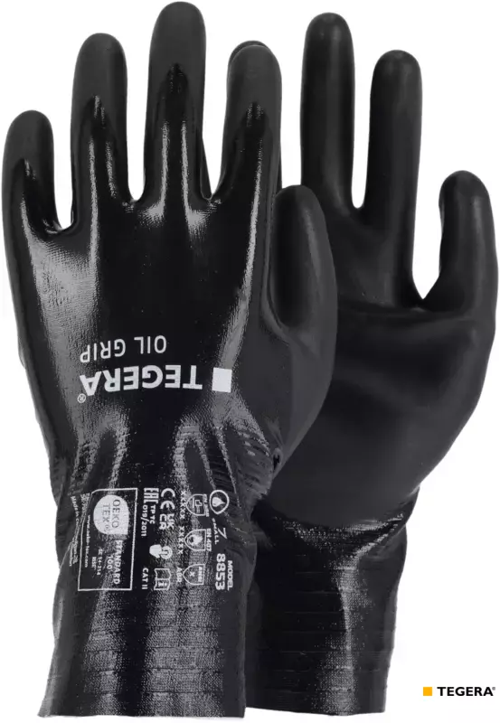 Handschoen met een uitstekende grip in olieachtige omgevingen. Waterdicht en met chemische goedkeuring type C. Volledig en drievoudig gecoat met nitrielschuim, en met een lange manchet. Voering met 18 gg-breitechniek en meer dan 90% gerecycled polyester. Touchscreen. Oeko-tex goedgekeurd.