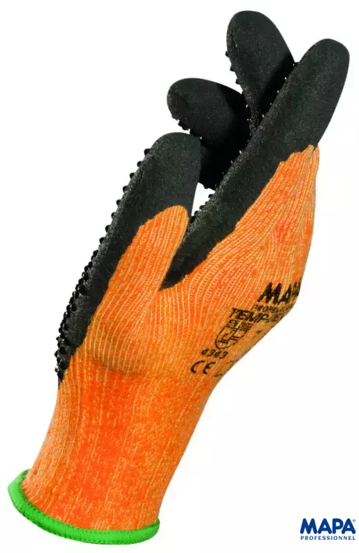 Vingergevoelige handschoen met nitril coating en nopjes. Coating bestand tegen contacthitte van 250°C gedurende 15 sec. Handschoenen GS industrie.