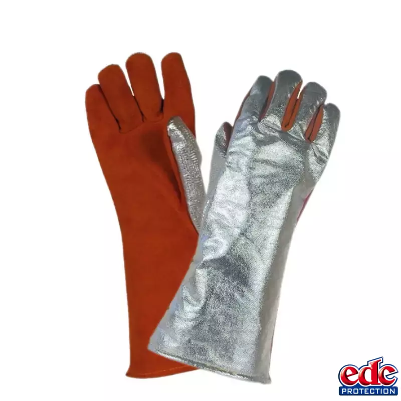 5-vingerhandschoen met handpalm in splitleder en gealuminiseerde rug. Voering in wol. Naden in Kevlar. Handschoen met contacthitte 100°C. Materialen zijn bestand tot 250°C.