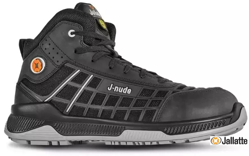 Hoge schoen in zwart waterafstotend pull-up leder en textiel, voorzien van een TPU-rooster met een niet metalen antiperforatiezool en een synthetische 200J neus. Voorzien van een ademende, abrasiebestendige voering in 3D-meshmateriaal. Zool in PU/PU, SRC antislip, bestand tegen oliën en zuren. Inlegzool Soft+ Gel in polyurethaan met textiel laag. 100% metaalvrij. Maten: 35-47.