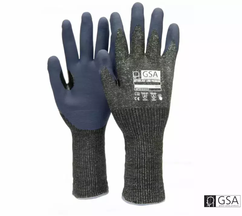 Gebreide snijbestendige handschoen (lange manchet 13cm) met een nieuwe foam nitril coating met touch sreen functionaliteit. De lining bestaat uit hoog snijbestendige PE vezels, nylon en Spandex. De nitril coating (op de palm) zorgt voor een uitermate goede grip op droge, maar ook op natte en beoliede oppervlakten. Zeer comfortabel en uitstekende bescherming tegen abrasie en met een extra versteviging tussen duim en wijsvinger. Geeft ook bescherming tegen contacthitte tot 100°C. Toepassing: glasindustrie, assemblage metalen, spuitgieten van kunststoffen. Beschikbare maten: 7- 12.