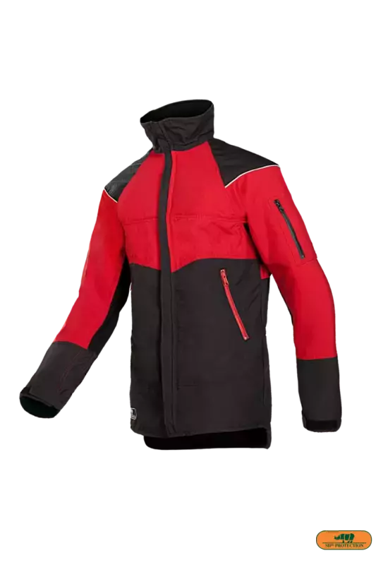 Pezatec en Pezaflex stretch buitenstof. Buitenstof waterafstotend behandelt met Teflon HP. Pezaflex inzetstukken onder de armen. Waterdichte TEKTOR versterking op de schouders met reflecterende bies. verlengd rugpand. rug-en okselventilatie. Elastische taille. Ergonomische kraag. Mouwvernauwing d.m.v. klittenbandsluiting. grote rode oppervlakte: armen en de borst. 1 opgezette smartphone zak op de linkerarm met “splashproof”. Ritssluiting. 2 ingezette zakken in de zij met “splash-proof” ritssluiting.