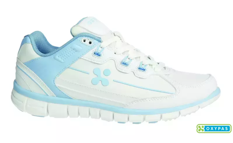 Lage sportieve schoen in microporeus afwasbaar leder met een ademende, kwalitateive binnenvoering in mesh nylon voor extra draagcomfort. De buitenzool, uit zeer licht materiaal (EVA) heeft een zeer goede antisliplaag (keuring SRA vanuit de veiligheidsschoenen) en is schokabsorberend. Maten: 36-42.