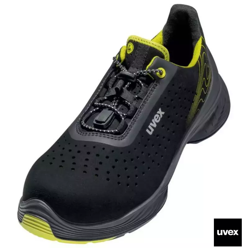 Lage, extreem lichte, metaalvrije en geperforeerde veiligheidsschoen in micro velours met een sportieve look en metaalvrije 200J neus. Voorzien van Uvex Climatec voering. Comfortabele, uitneembare inlegzool die anti- micotisch behandeld werd. Buitenzool in PU/TPU (i-PUREnrj). ESD-gekeurd. Maten: 35-52. Breedte: 10, 11, 12 en 14.