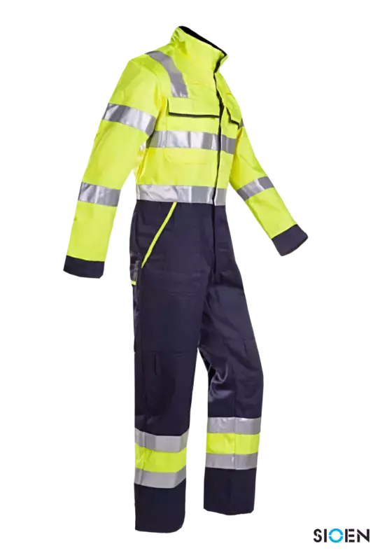 Signalisatie overall Macas met vlamboog bescherming: Rechte kraag; Ritssluiting onder klep met verborgen drukknopen; 2 opgezette borstzakken met klep; 2 opgezette schuine zakken met klep; 2 lussen voor gasdetectoren; 1 duimstokzak met klep; 1 achterzak met klep; 1 opgezette dijbeenzak met klep; 2 zijsplitten; Mouwvernauwing met drukknopen; Kniezakken; Vlamvertragende reflecterende tape. Kwaliteit: 79% FR katoen + 20% PES + 1% AST; ± 260 g / m². Beschikbare kleuren: Fluo geel / marine. Certificering: IEC 61482-2: 2009 klasse 1 – ATPV 9,4 cal / cm², EN ISO 11612: 2015 / A1 A2 B1 C1 E2 F1, EN ISO 14116: 2015, EN ISO 11611: 2015 / Klasse 1 – A1 A2, EN 1149-5: 2008, EN 13034: Type 6 en EN ISO 20471: 2013 + A1 2016 / Klasse 3.