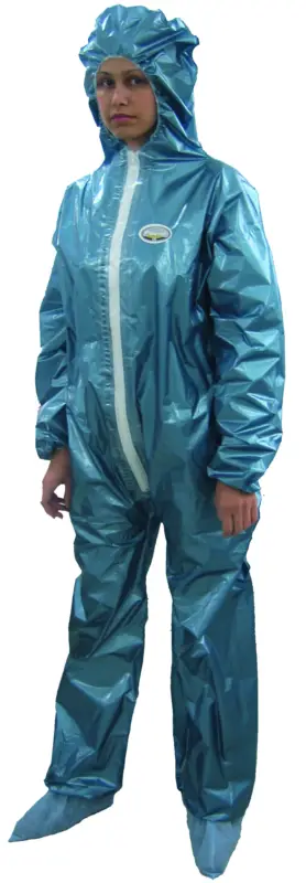 Blauwe overall in polyethyleenfilm met een dikte van 50 micron. De overall is voorzien van vaste kap, rugventilatie en elastiek in d e taille, aan de polsen en de enkels.