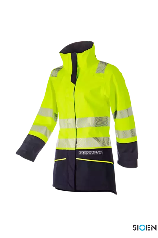 De Vaski is een signalisatie dames regenjas die tevens een hoge mate van bescherming biedt aan de drager. De jas is gemaakt van een lichte, maar hoogwaardige stof en voldoet aan vele internationale normen zoals IEC 61482-2, EN ISO 11612, EN ISO 11611, EN 1149-5 en EN 13034. Deze premium jas is voorzien van een YKK ritssluiting met handige grip voor eenvoudig openen en sluiten. De mouwuiteinden zijn voorgevormd en de achterkant is verlengd voor uw comfort. Beschikbare maten: XS-2XL. Beschikbare kleuren: Fluo geel / marine en fluo oranje / marine. In overeenstemming met: IEC 61482-2 klasse 1, EN ISO 11612 A1.A2.B1.C1.E1.F1., EN ISO 11611 klasse 1, EN 1149-5, EN 13034, EN ISO 20471 klasse 3., EN 343 4: 4.