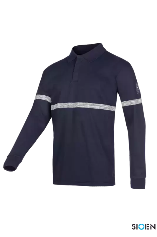 Vlamvertragende en antistatische poloshirt Bladel met ARC-bescherming: Platte kraag; Sluiting met verborgen knopen onder de flap; Ronde mouwen; Gesegmenteerde reflecterende tape (2,5 cm); Ruglengte 74 cm (L). Samenstelling: 55% Protex + 33% katoen + 10% p-Ar + 2% AST; ± 230 g/m². Beschikbare maten: S-3XL. Beschikbare kleur: Marine. In overeenstemming met: EN ISO 11612 A1B1C1F1, EN 1149-5, IEC 61482-2: 2018 APC1 – EBT 14,7 cal/cm² en EN ISO 14116: 2015 / IND.3.