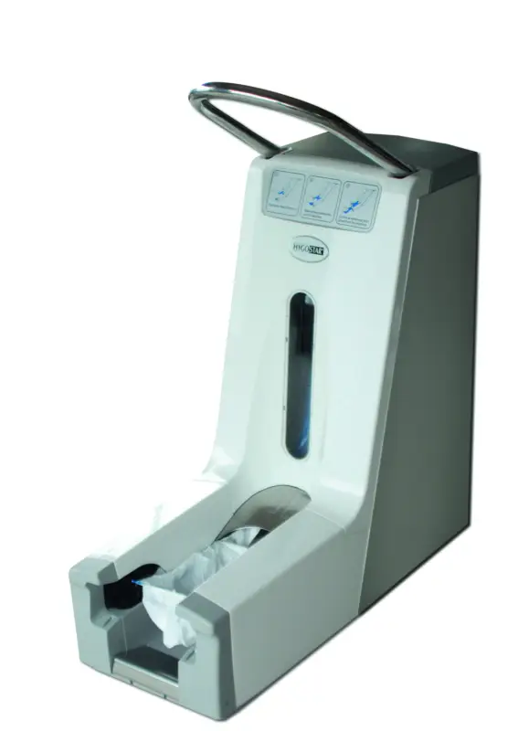 Step-In shoe Cover, de innovatie op het gebied van hygiëne en ergonomie. Het aantrekken van een hygiënische overschoen ging nog nooit zo snel en makkelijk. Geen kruisbesmetting, de shoe cover wordt automatisch over de schoen getrokken. In minder dan 3 seconden heeft u een shoe cover aan. Een eenvoudige machinale handeling. De display geeft het beschikbare aantal shoe covers duidelijk aan, en heeft een capaciteit van 200 overschoenen. artikel overschoenen: 1006376.