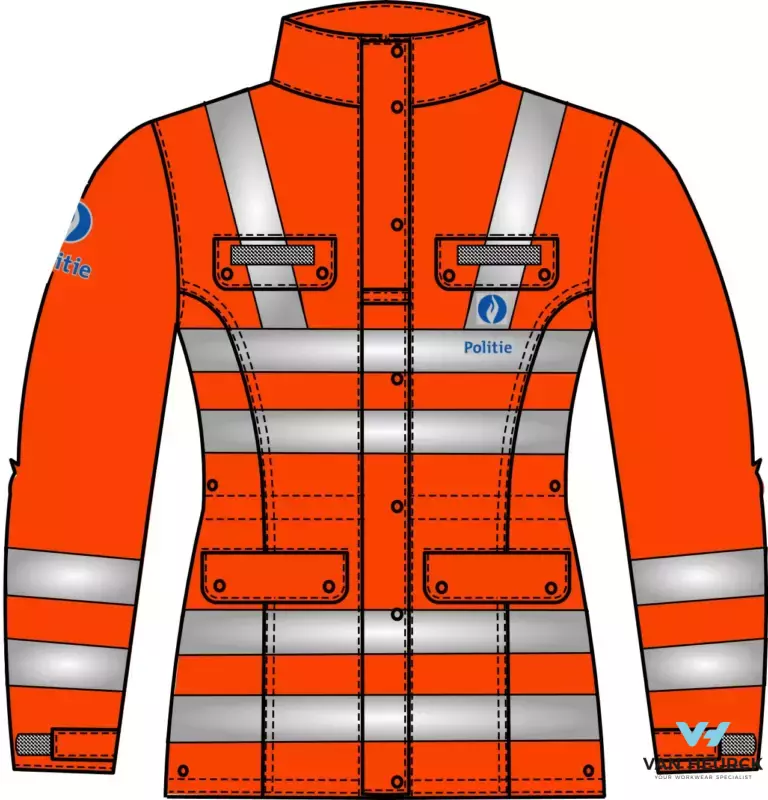 Verkeersparka politie damesmodel in 100 % polyester met e-PTFE laminaat. Voering in 100 % polyester. Ritssluiting onder beleg met drukknopen, 2 borstzakken met klep, radiolus, 2 napoleonzakken, 2 binnenzakken met balpenhouder en radiozak, 2 voorzakken met klep, aanpasbare manchetten d.m.v. velcro, opstaande kraag met kap. Taalkenmerk: NL. Beschikbare maten: BE32-BE68. Beschikbare kleuren: fluo oranje.